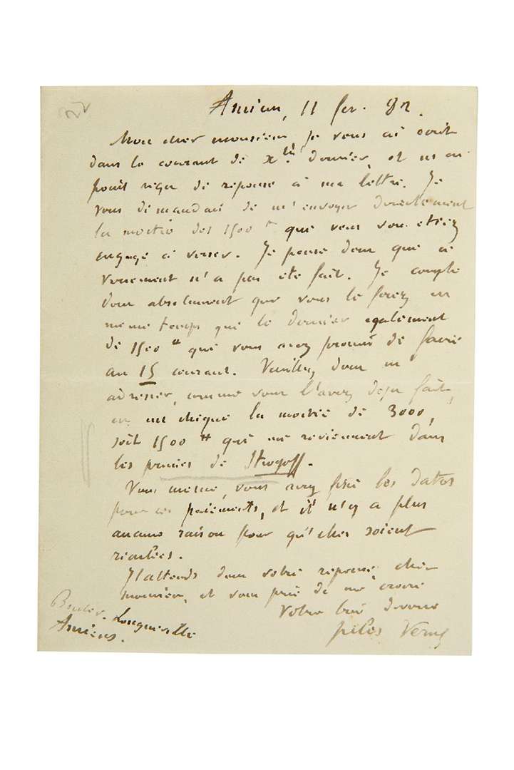 L.A.S. «Jules Verne», Amiens 11 février 1882 | 1 page in-12.