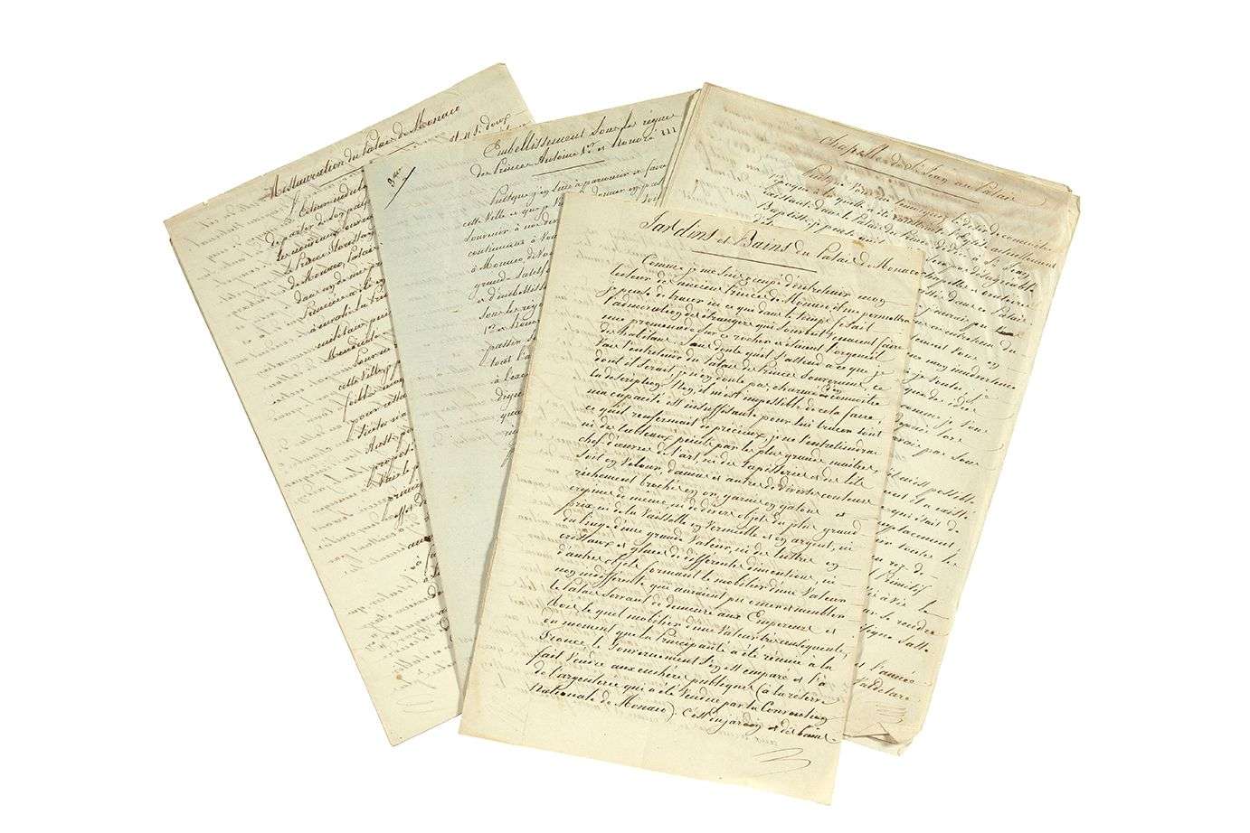 Chapelle de St Jean au Palais (brouillon et mise au net). - Jardins et Bains du Palais de Monaco. - Palais des Princes de Monaco. - Embellissement sous les règnes des Princes Antoine 1er et Honoré III. - Restauration du Palais de Monaco.