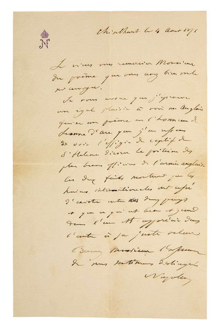 L.A.S. «Napoléon», Chislehurst 4 août 1871, à Robert Steggall, à Chiswick | 1 page in-8 à son chiffre couronné, enveloppe.