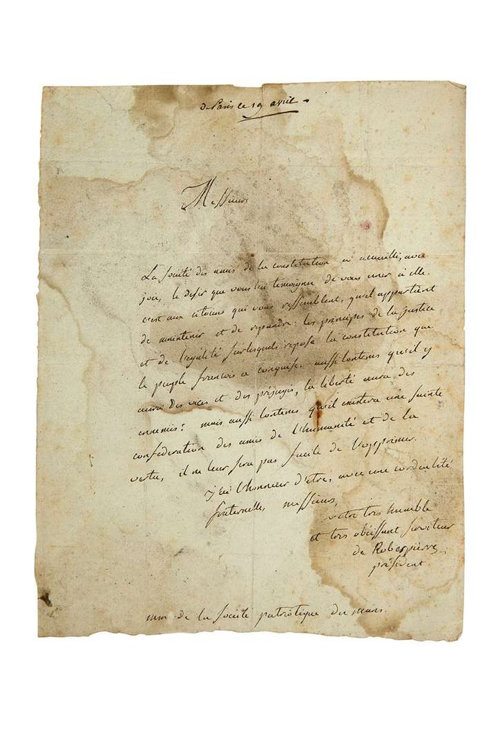 L.A.S. «de Robespierre président» comme président de la Société des Amis de la Constitution, Paris 19 avril [1790], à la Société patriotique du Mans | 1 page in-4 (mouillures et taches, qqs petites fentes réparées).