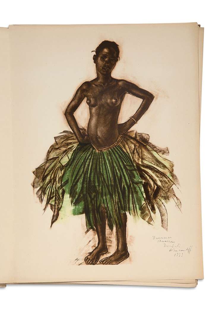 Célèbre recueil de 50 planches en couleurs d'après les compositions du peintre Alexandre Iacovleff (1887-1938), réalisées durant la Croisière noire organisée par André Citroën à travers l'Afrique, entre octobre 1924 et juin 1925. Le texte est également illustré de croquis du peintre.