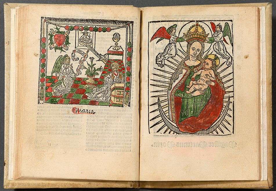 L'exemplaire est entièrement rubriqué à l'encre rouge, et les deux gravures, les marques du libraire et une grande lettrine ont été réhaussés en vert, rouge et jaune. (USTC 111344, 1 seul exemplaire localisé, BNF Rés H2224 | et 111335, aucun exemplaire localisé : «lost book»).