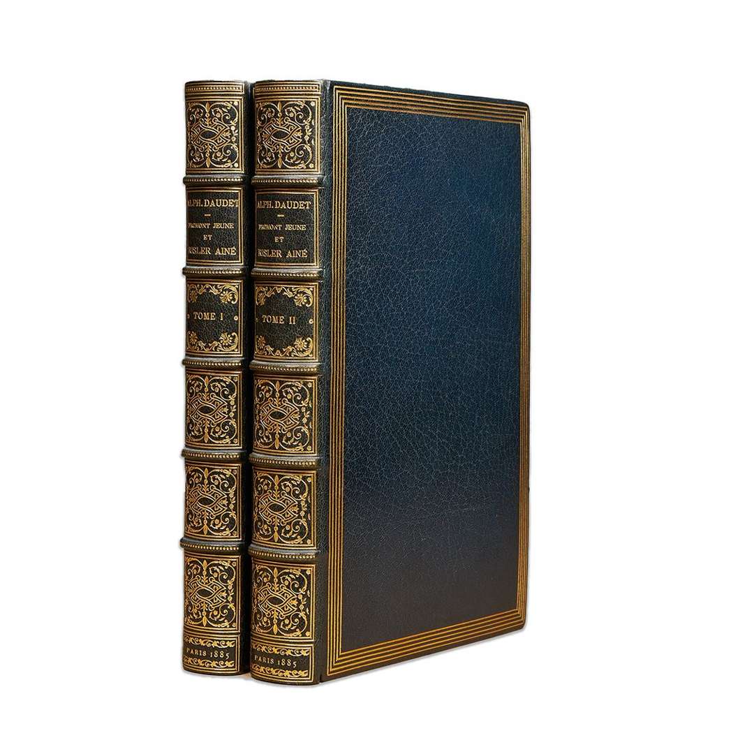 Fromont jeune et Risler ainé, moeurs parisiennes. Paris, L. Conquet, 1885. 2 volumes in-8, maroquin bleu foncé, dos à 5 nerfs saillants ornés de pointillés dorés, auteur, titre et tomaison dorés, lieu et date frappées en queue, caissons richement ornés, plats encadrés de 5 filets dorés, double filet doré sur les coiffes et coupes, dentelle intérieure, tranches dorées sur témoins, couverture et dos conservés [Champs] (dos très légèrement passés, infimes frottements aux coupes en pied.).
