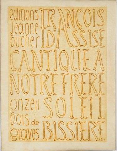 Cantique à notre frère soleil. Onze bois gravés de Bissière. Paris, Jeanne Bucher, 1954. In-folio, en feuilles sous couverture rempliée formée d'une feuille de parchemin, portant le titre gravé tiré en bistre sur le premier plat, chemise et étui éditeur (infimes frott. à l'étui).