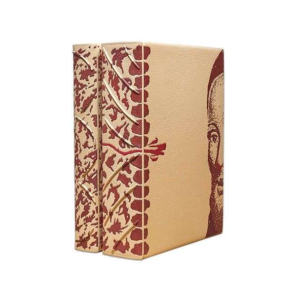 Gargantua. S.l., Les Bibliophiles de Provence, 1955. Deux forts volumes grand in-4 (texte + suites), (vol. de texte) : maroquin crème décoré aux plats et dos de pièces de maroquin havane mosaïquées, évoquant une représentation de la guerre Picrocholine, avec au plat inf. la moitié du visage de Rabelais d'après une illustration ancienne, le dos muet portant six pièces courbes en relief, contreplat sup. décoré d'un portrait de Rabelais d'après Matisse mosaïqué, au contreplat inf. figure le titre en lettre de style ancien mosaïquées, gardes de daim gris, tête dorée, non rogné,couv. et dos conservés, chemise toilée protégeant le texte, chemise de cuir noir portant le titre en lettre mosaïquées au dos, le nom de l'auteur et une figure mosaïqués au plat sup., étui de satin moiré gris décoré | (vol. de suites) : reliure similaire avec l'autre moitié du visage de Rabelais, au contreplat sup. un portrait de Gargantua, et au contreplat inf. le nom de Rabelais, chemise et étuis similaires.