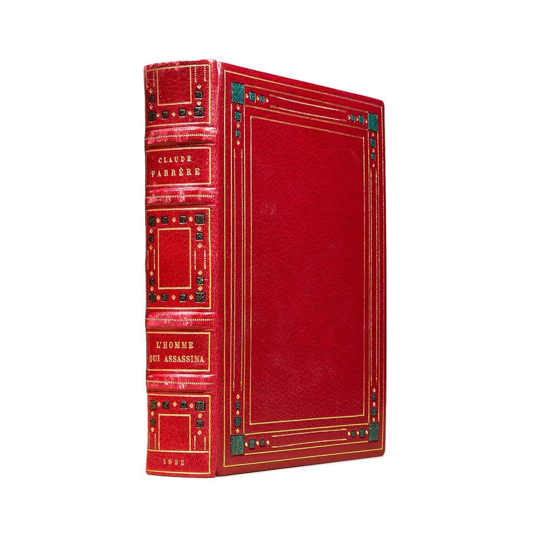 L'homme qui assassina. Paris, Atelier du livre, 1932. In-8, [5] f. (dont 2 bl.), 242 p., [2] f., maroquin rouge, dos à 4 nerfs orné de pointillés dorés, encadrement avec pièces mosaïquées, filets et pointillés dorés aux caissons, aux plats, et aux bords des contreplats doublés, double filet et pointillés dorés sur les coiffes et coins, doublure et gardes de satin rose, deuxième garde marbrée, tranches dorées sur témoins, couverture et dos conservés [Ét. Jean] (dos légèrement passé, frott. aux nerfs et coiffes et coins de queue).