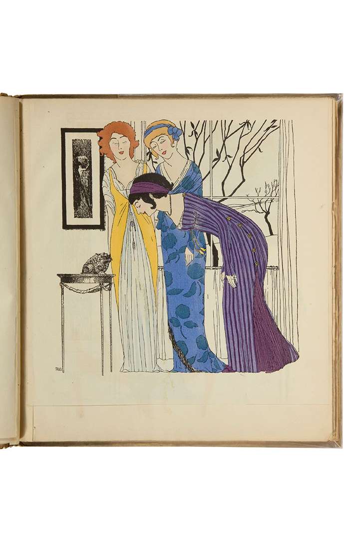 Les robes de Paul Poiret racontées par Paul Iribe. Se trouve à Paris, chez Paul Poiret, couturier, 1908. In-4, cartonnage éditeur, dos muet, titre imprimé en rouge et noir au plat sup., montage sur onglets (sans la jaquette | dos usé avec traces d'adhésif et lacunes de couvrure mais cart. solide, plat lég. défraîchis). [2] f. (titre, justification), [1] f. blanc, [10] planches gravées et coloriées, [3] f. (1 bl., achevé d'imprimer, 1 bl.).