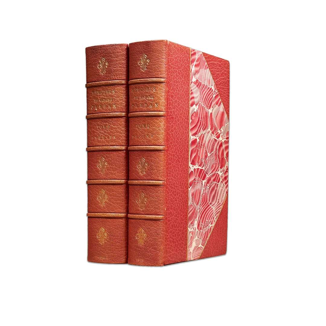 Mémoires de Madame Campan, sur la vie privée de Marie-Antoinette. Paris, L. Carteret, 1910. Deux volumes in-8, [3] f., XXV-291 p. + [2] f., 286 p., [1] f., demi-maroquin rose à coins, dos à 5 nerfs ornés de pointillés dorés, titre et tomaison dorés, f leur de lys en f leuron doré répété, double filet doré sur les plats, tête dorée, non rogné, couvertures et dos conservés [R. et R. Nativet] (dos passés).