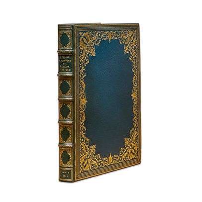 La rôtisserie de la reine Pédauque. Paris, Édouard Pelletan, 1911. In-4, maroquin bleu, dos à 5 nerfs, auteur, titre, lieu et date dorés, caissons ornés, plats encadrés de filets et d'une large dentelle, avec figures de poulets rôtis en f leurons angulaires, le tout doré, double filet doré aux coupes, doublure de maroquin gris orné d'un cadre de filets multiples et d'une large roulette, le tout doré, gardes de toile à motifs f loraux, couv. et dos conservés, tranches dorées, étui [Blanchetière] (nerfs passés et un peu frottés, étui frotté).