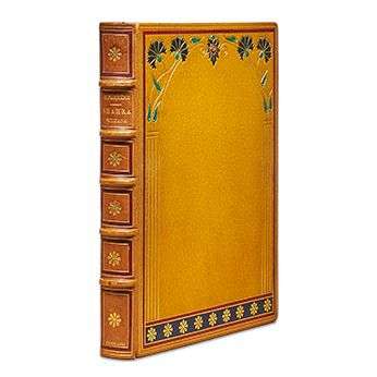 Shahra sultane, ou les sanglantes amours authentiques et mirifiques de Sultan Shah'Riar, roi de la Perse et de la Chine, et de Shahrâ sultane, héroine. Paris, Dorbon 1923. Petit in-4, maroquin citron, dos à 5 nerfs saillants, auteur, titre, lieu et date dorés, caissons ornés d'un f leuron doré et bordés d'un listel mosaïqué, plats décorés d'une composition formant cadre architectural, avec filets dorés, listel en bordure et pièces f lorales mosaïquées, pointillé doré aux coupes, contreplats bordés de maroquin orné d'une roulette, de 3 filets et de f leurons angulaires, le tout doré, doublure et garde de satin moiré ocre, deuxième garde de papier marbré, tête dorée, couv. et dos conservés, non rogné [Flammarion Vaillant] (dos bruni, petit accroc une coiffe).