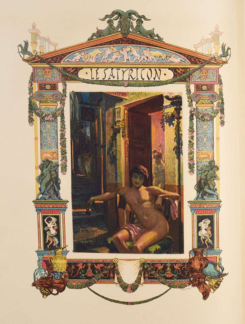 Le Satyricon. Paris, Louis Conard, 1910. In-folio, [3] f., 296 p., pl., maroquin vert olive, dos à 4 nerfs saillants, auteur, titre et date dorés, filet doré sur les nerfs, caissons et plats encadrés d'un jeu de filets, points et f leurons angulaires, le tout doré, contreplats bordés de maroquins et ornés de même, double filet doré sur les coupes et coiffes, doubles gardes de satin moiré et papier marbré, non rognés, tête dorée, tranches dorées sur témoins, couverture et dos conservés [Meunier] (dos passé, petit frottement sur deux coins | transferts en regard des pl.).