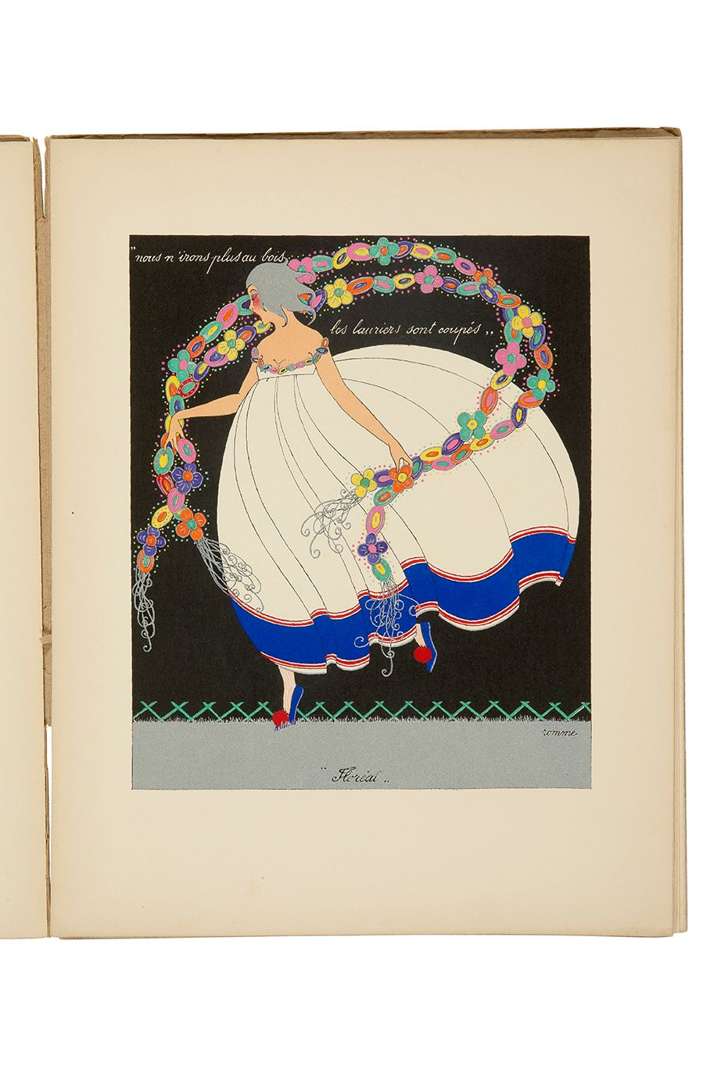 Bel album composé de 12 compositions imprimées et coloriées au pochoir, certaines rehaussées à l'argent. Chaque planche, titrée du nom d'un mois révolutionnaire, offre un modèle féminin en pied revêtu d'une robe extravagante, évoquant d'une façon un peu caricaturale la haute couture de l'époque Art Déco.