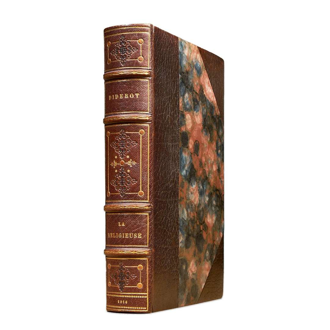 La religieuse. Paris, J. Chevrel, 1916. In-8, [3] f. dont 1 bl., IX-311 p., [4] f. dont 2 bl., demi-maroquin havane à coins, dos à quatre nerfs saillants ornés d'une roulette dorée, auteur et titre dorés, date frappée en queue, caissons ornés de 4 fers à froid, de f leurons dorés et bordés d'un filet doré avec petits cercles mosaïqués aux angles, tête dorée, non rogné, couverture et dos conservés (dos passé).
