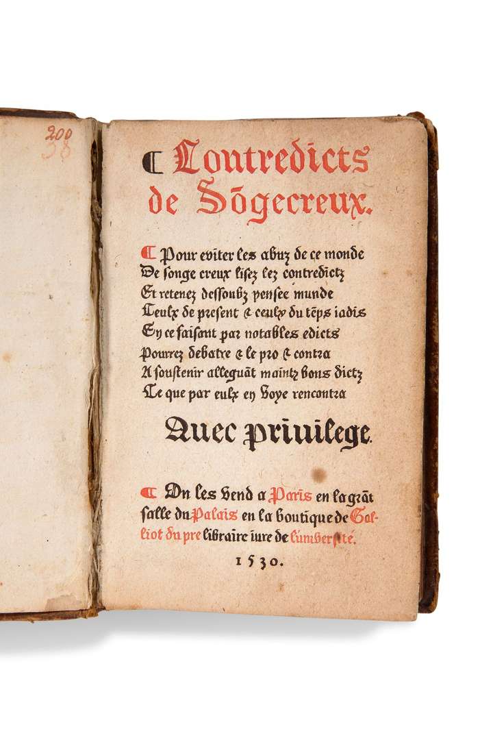 Contredicts de So[n]gecreux. Paris, Galliot du pré, 1530. In-16 (125 x 92 mm), 179 ff. numérotés (erreur numérotation, manque f.cxliiii), en français. Plein veau moucheté, dos à nerfs orné, pièce de titre de maroquin rouge, tranches rouges (reliure XVIIIe siècle). (Mouillure importante sur quelques feuillets, restaurations anciennes).