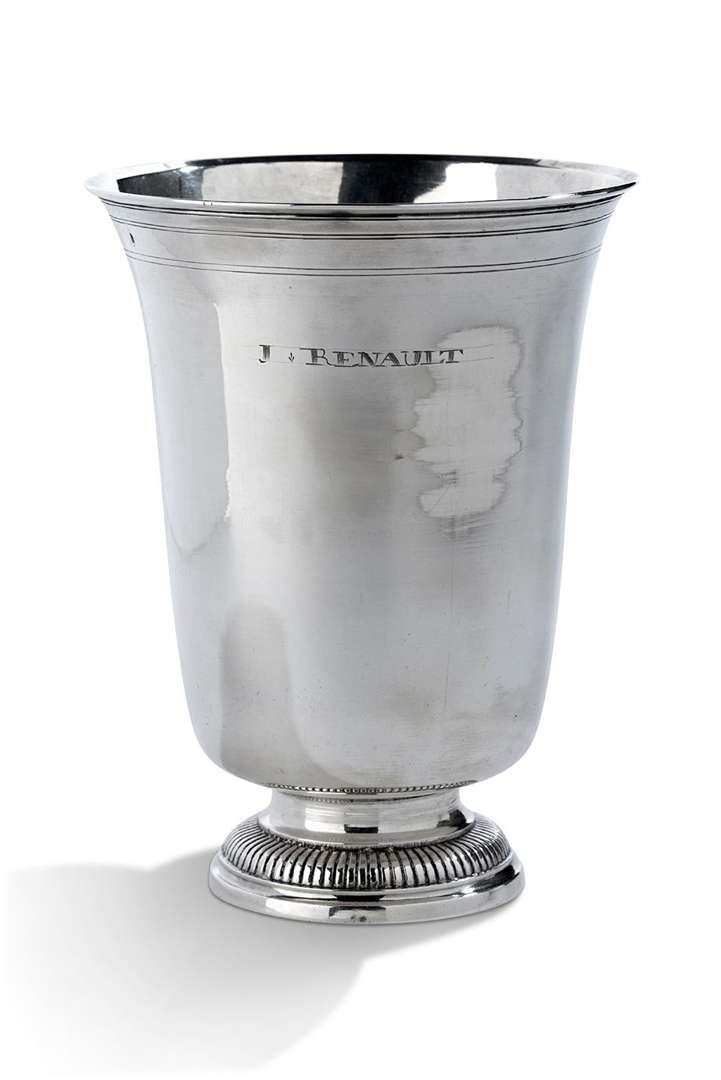 en argent de forme tulipe. La panse gravée J. RENAULT et soulignée de deux filets. Repose sur un piédouche godronné.