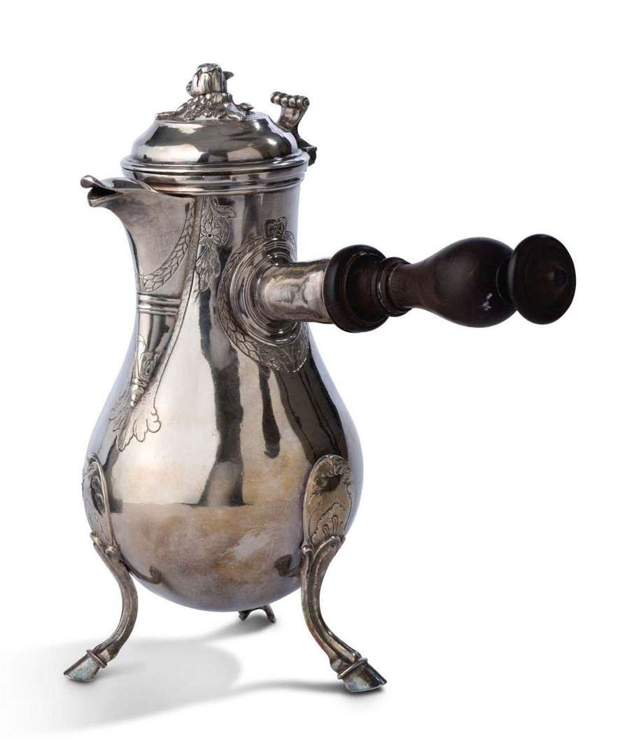 en argent. La panse de forme ovoïde et le manche en bois tourné. Le bec verseur et l'encadrement du manche orné d'un décor gravé de guirlandes fleuries et feuillagées.