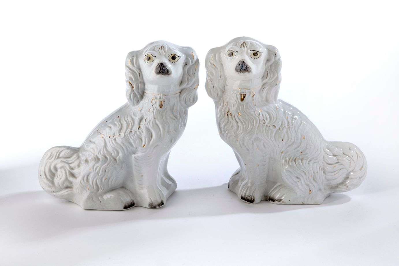Paire de sujets en faïence émaillée blanc et noir et réhaussés de dorures