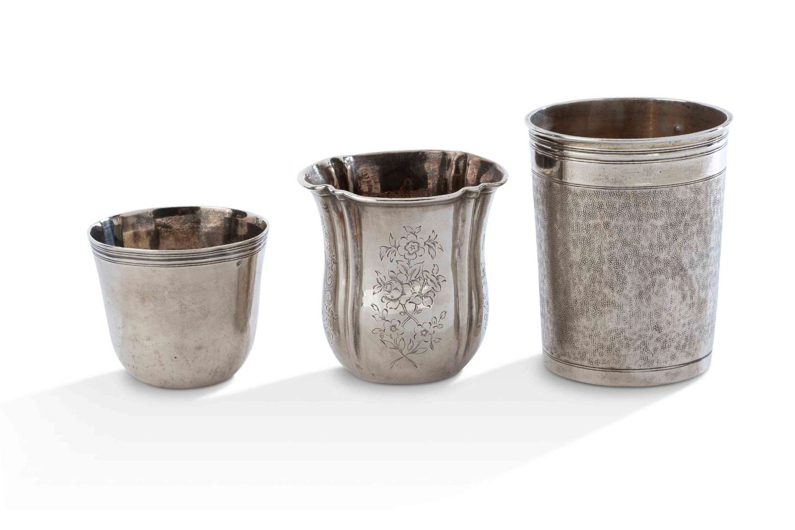 - Une timbale tulipe en argent, la panse à décor gravé de bouquets floraux. Poinçon Minerve.