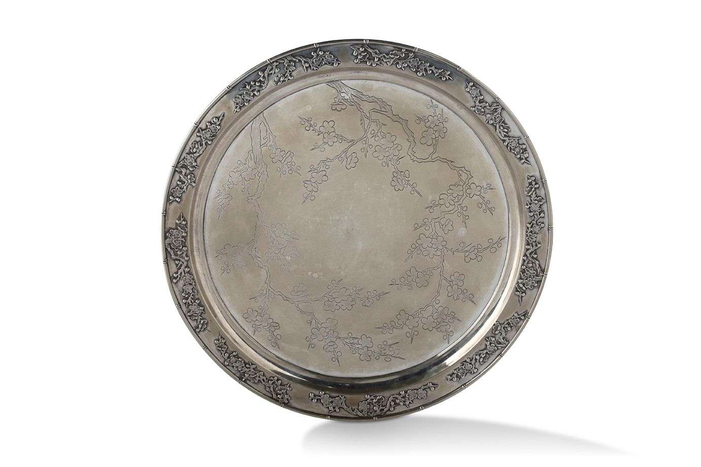 Plateau circulaire en argent décoré de prunus en fleurs gravés, l'aile également ornée de branches de prunus appliquées, la lèvre à l'imitation du bambou. Le revers avec la marque du détaillant « Luen Wo », la mention «Shanghai» et la marque de l'orfèvre « Qiu Ji ».