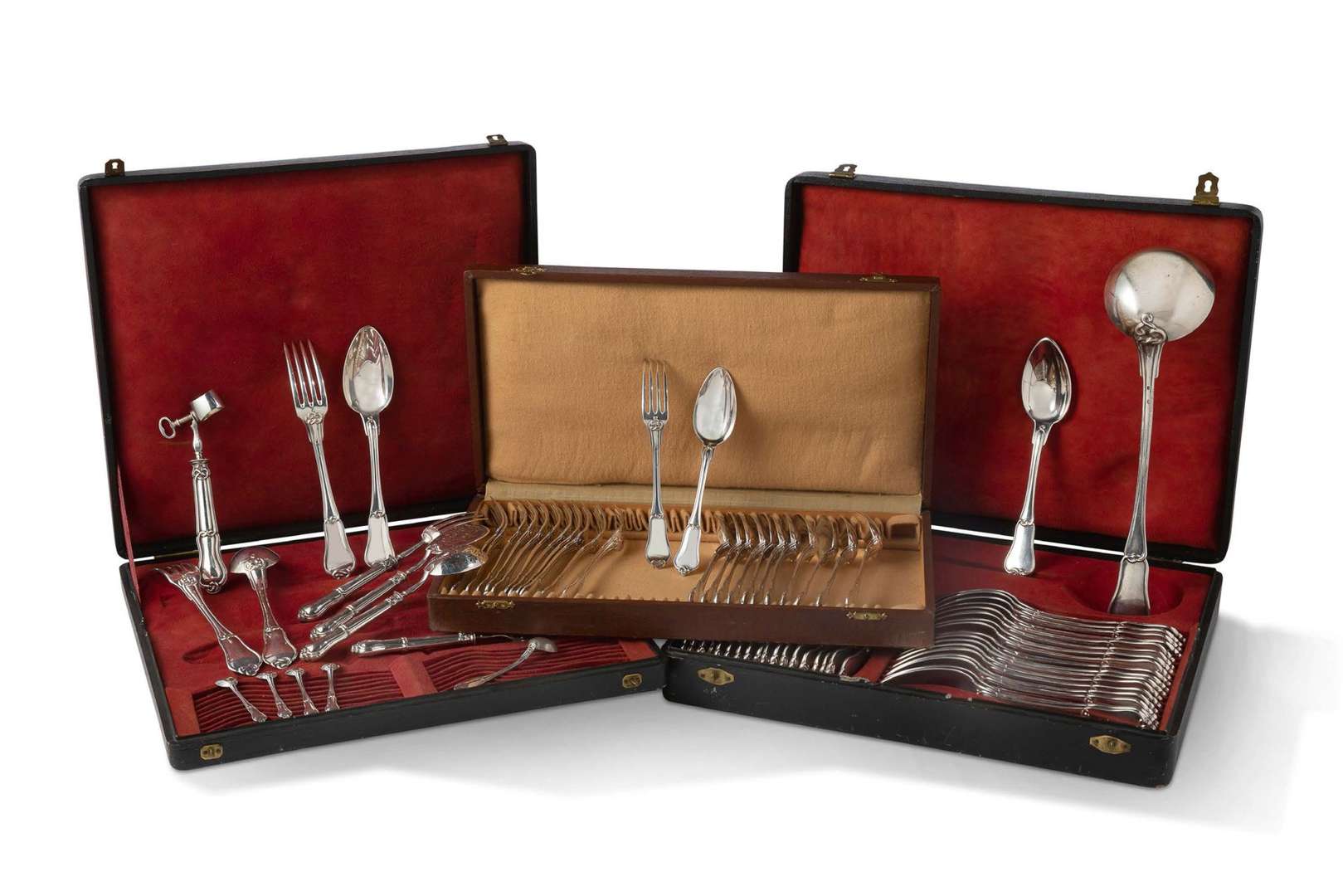recomposée en argent à modèle au noeud Gordien comprenant : - Vingt couverts (fourchettes et cuillères) - Douze couverts à entremets (fourchettes et cuillères) - Une louche - Une petite louche - Quatre cuillères à salerons