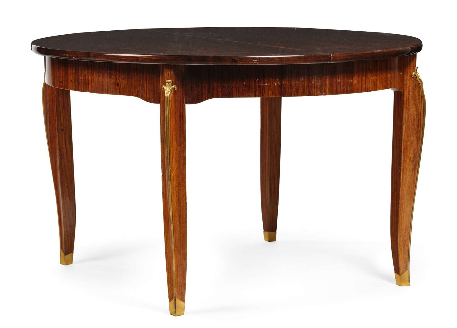Table de salle à manger circulaire à quatre pieds en placage de palissandre et fines chutes de bronze doré sur les pieds légèrement galbés et sabots simples.