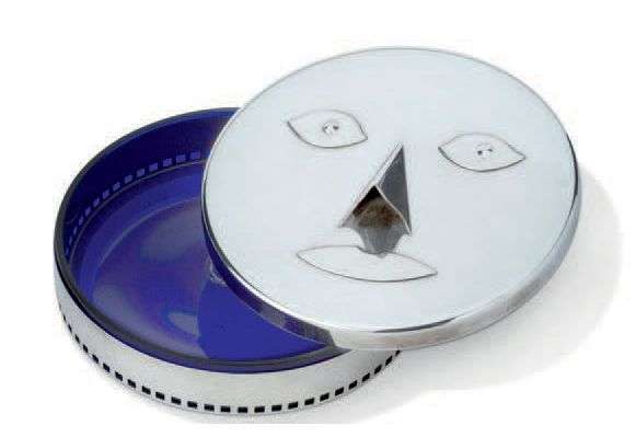 En argent et verre de Murano teinté bleu, le couvercle à décor d'un visage.