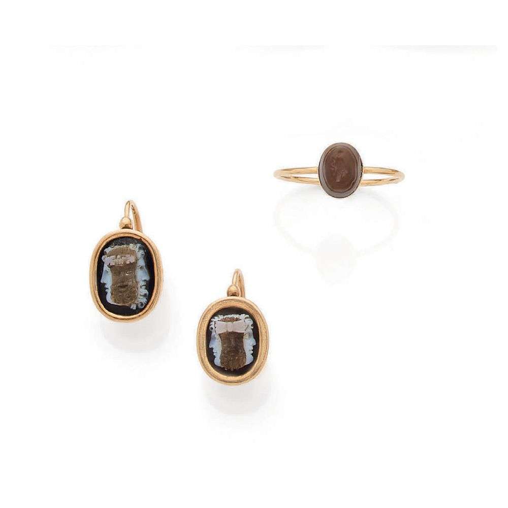 Bague ornée d'un intaille (antique?) et paire de boucles d'oreilles ornées d'un camée figurant un portrait à l'antique tricéphale.