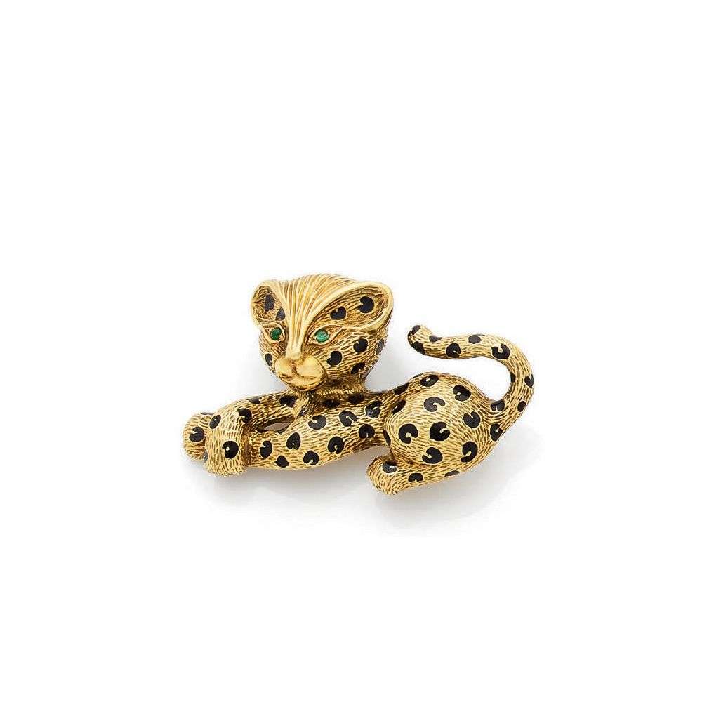 An emerald, enamel and gold brooch, signed Fred