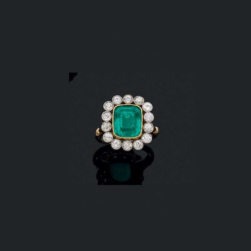 An emerald, diamond, gold and platinum ring, report