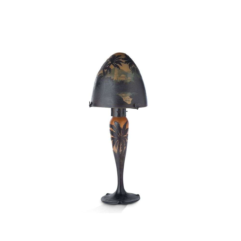 A lamp, multi-layered glass with acid-etched decoration, wrought-iron mount. Signed.