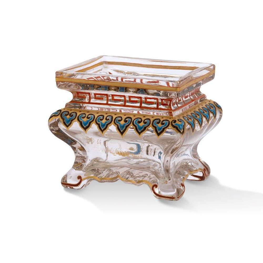 En verre translucide, à décor émaillé or, rouge, noir et bleu de frises dans le goût asiatique.