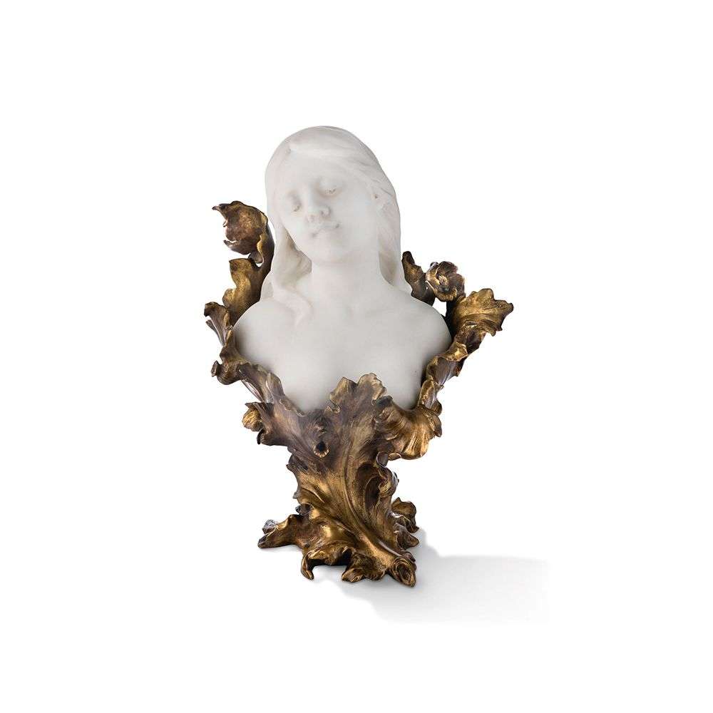 Rare sculpture en marbre blanc de Carrare et bronze à patine dorée, figurant un buste de jeune femme ceint de feuilles de pavots fleuries.