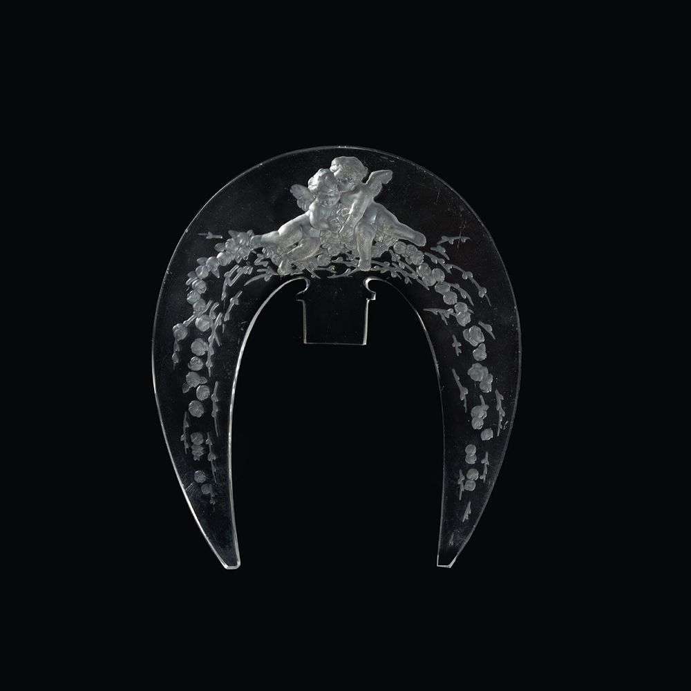 En verre moulé-pressé, à décor de deux amours sur des branchages fleuris.