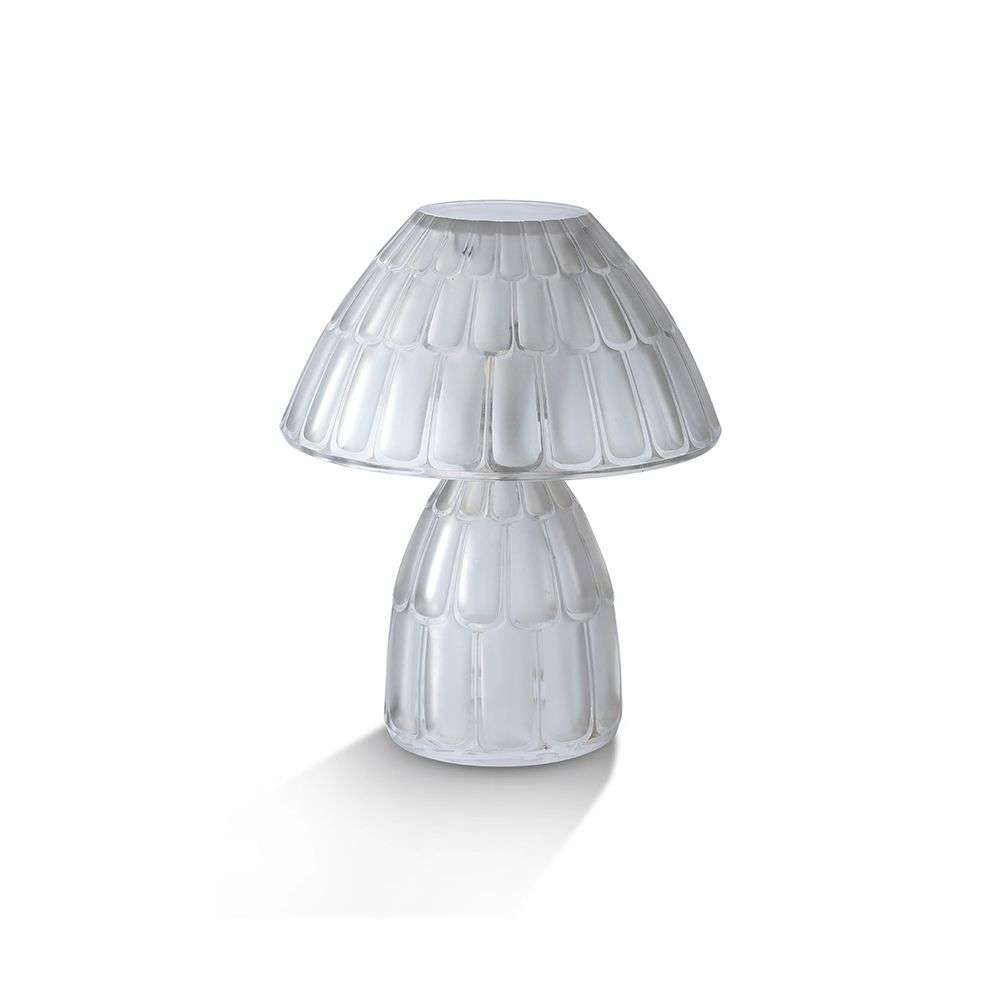 En verre moulé-pressé satiné, le pied et l'abat-jour à décor d'arceaux.