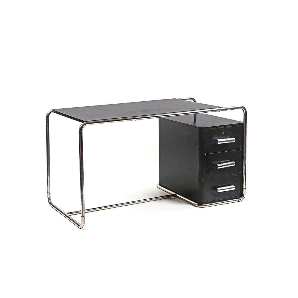 A « B 282 » desk, c. 1935, re-chromed metal structure, blacken wood top and drawers.