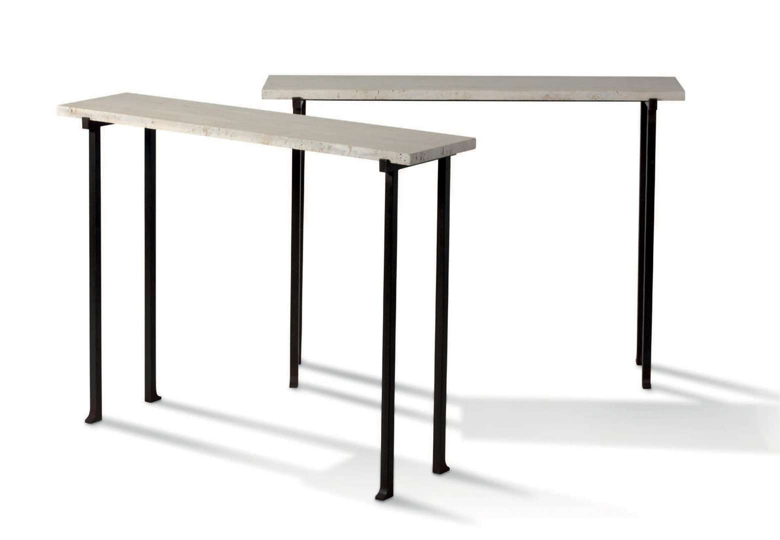 Structure en fer forgé, plateau rectangulaire en travertin.