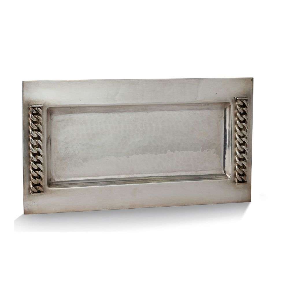 En métal argenté, à fond en creux martelé, large bordure ornée de deux chaînes à maillons plats.