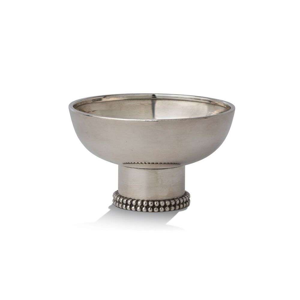 A circular cup on a pedestal, silver metal.