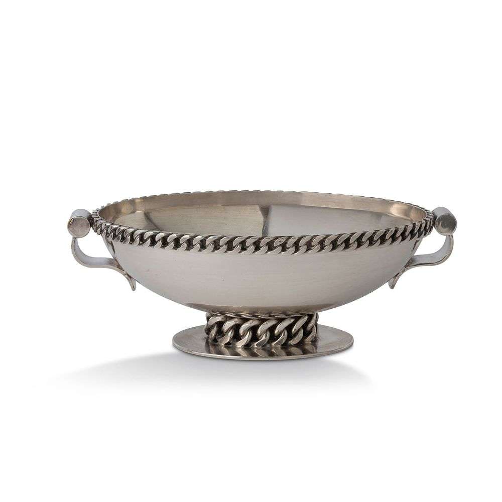 En métal argenté, à deux prises latérales en enroulement, le corps de la coupe ovale et le pied ornés de deux chaînes à maillons plats. Signature incisée « J. Desprès », datée « 1973 ».