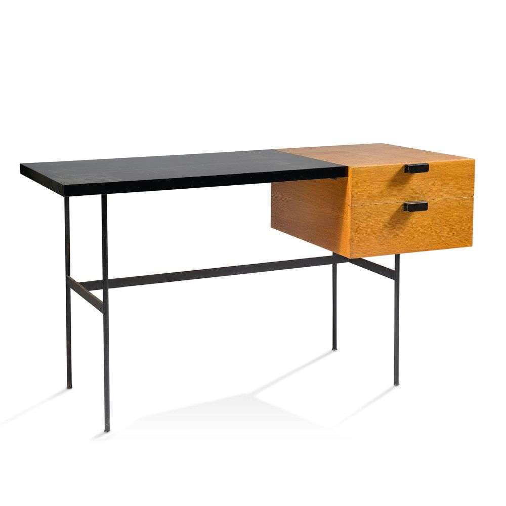 A « CM 141 » desk, designed in 1953, black formica top, oak veneer drawer unit, black lacquered metal base.