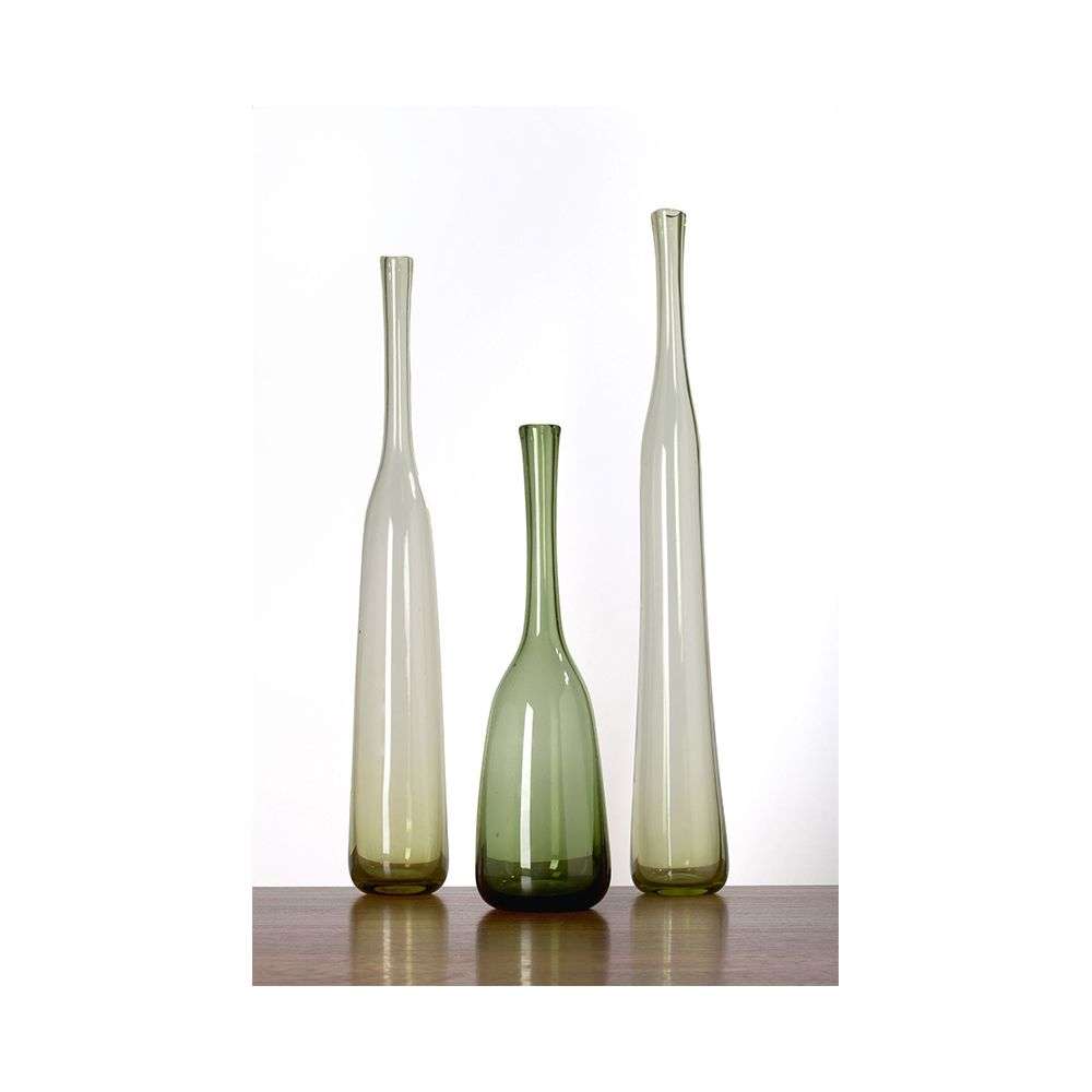 A set of three « bouteilles folles » vases, designed c. 1970, tinted blown glass. Signed.