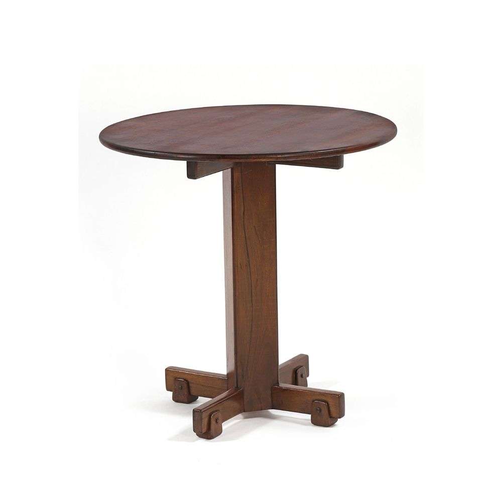 Plateau circulaire en palissandre et placage de palissandre teinté, reposant sur un piètement cruciforme en palissandre.