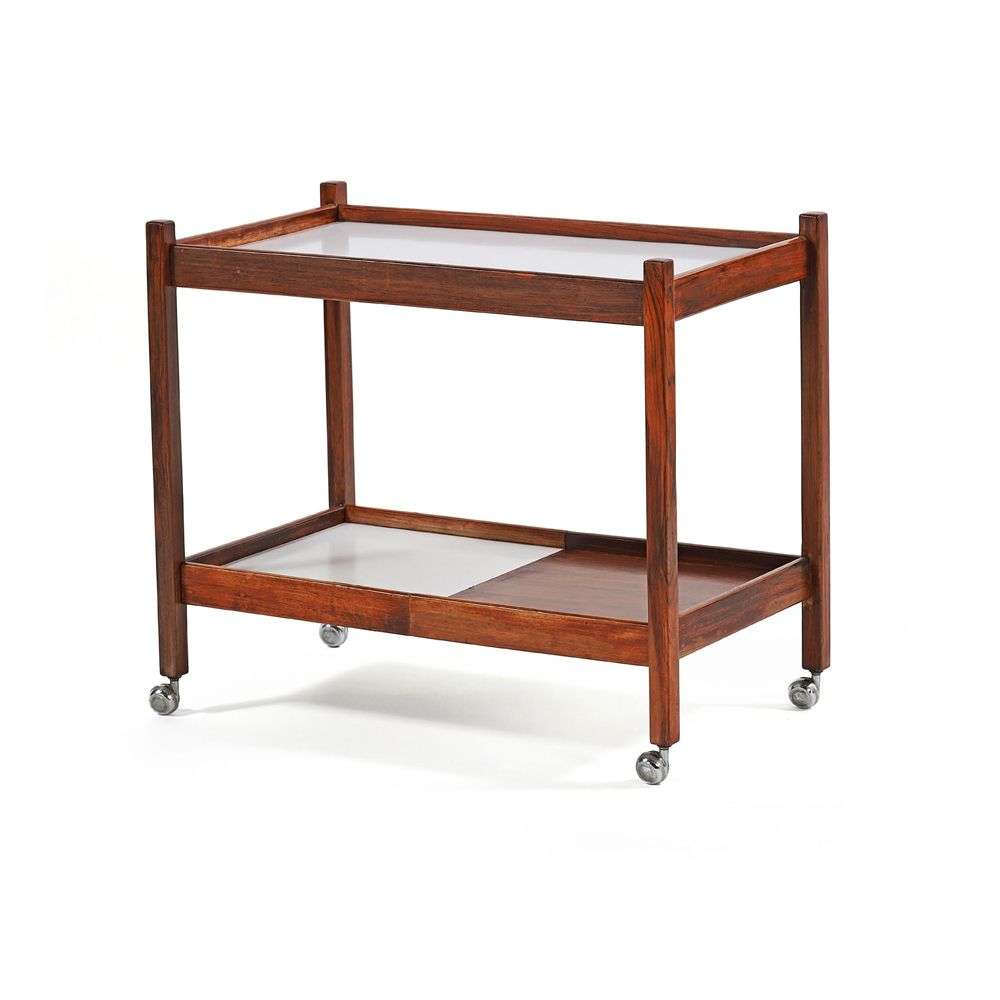 A trolley, c. 1960, rosewood structure, removable formica trays, metal wheels.