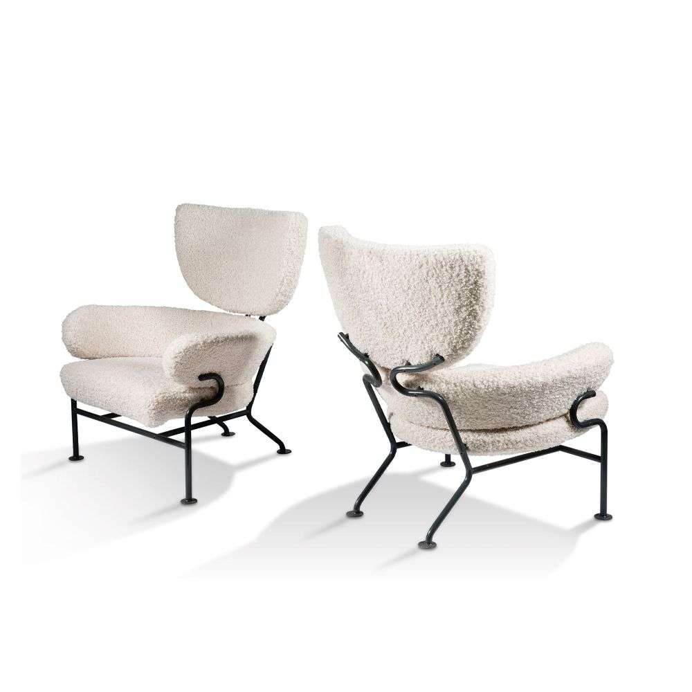 A pair of « PL 19 » armchairs, designed c. 1957, grey relacquered metal base, late white woolen upholstery.