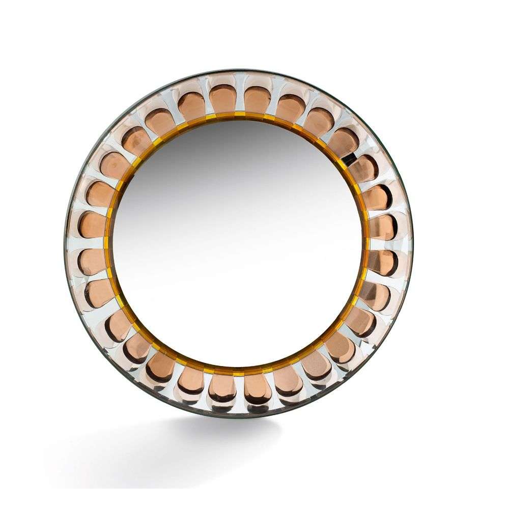 Encadrement en miroir incurvé accueillant des pétales en verre teinté rose, miroir bordé d'un liseré en verre teinté orange, structure en métal laqué blanc.