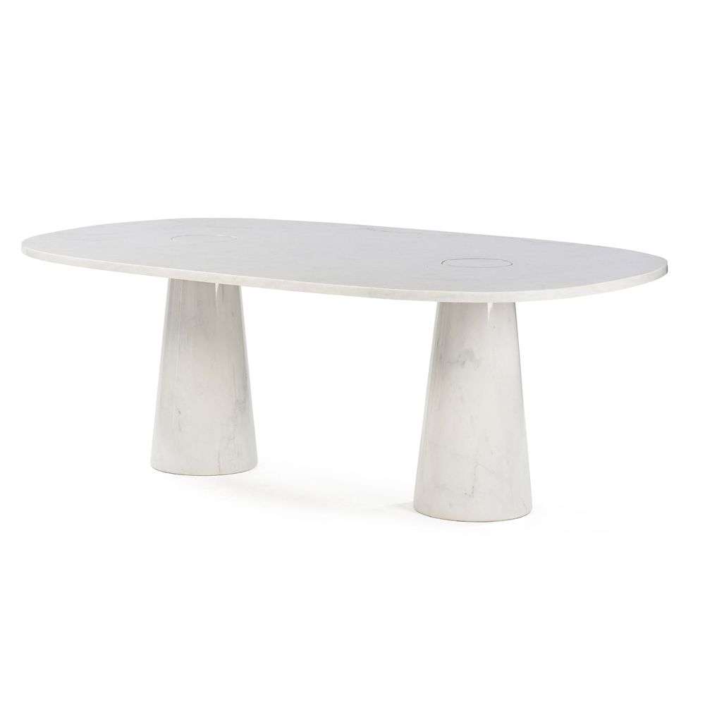 En marbre blanc veiné gris, plateau ovale formé d'une épaisse dalle évidée de deux cercles accueillant chacun un haut pied conique.