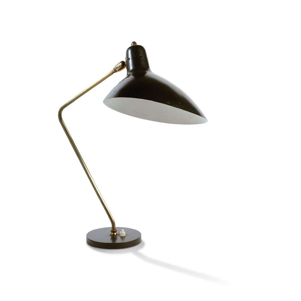 A desk lamp, c. 1950, rotating lacquered metal reflector, brass arm, black lacquered base.