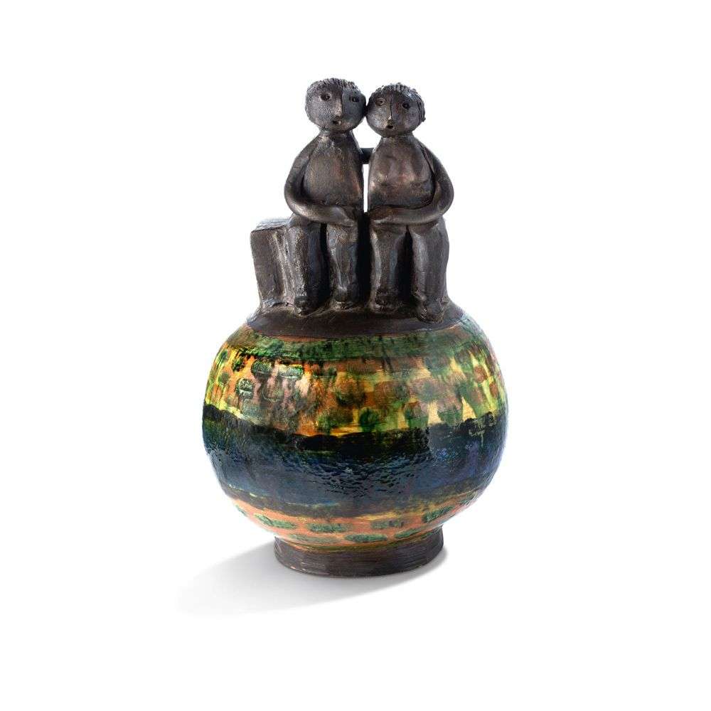 Importante sculpture en terre chamottée, émaillée polychrome à l'engobe et alquifoux, émail brun à reflets cuivrés, représentant un couple assis sur un banc, reposant sur une sphère.