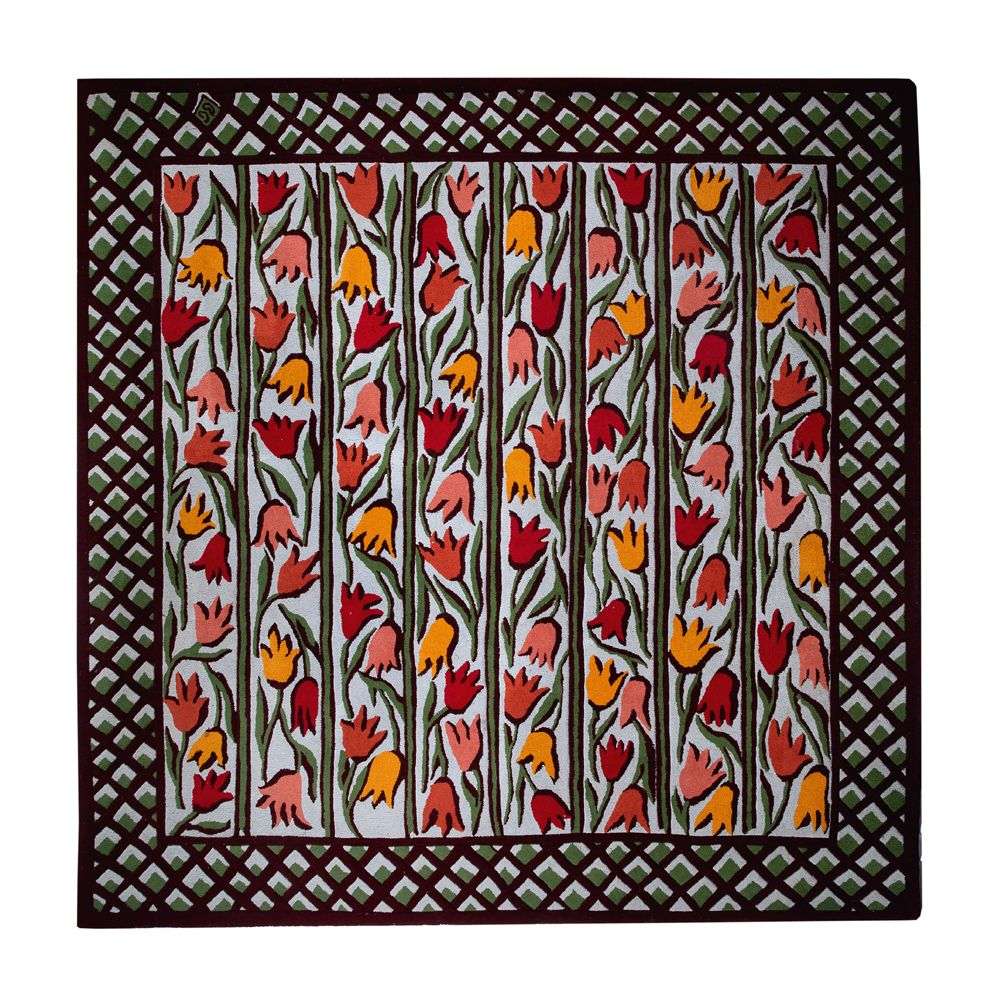 En tuft haute laine, à décor d'une jonchée de tulipes formant bandes, teintes roses, rouges, jaunes et vertes sur fond blanc cassé, bordure formant résilles noires et vertes sur fond blanc cassé.