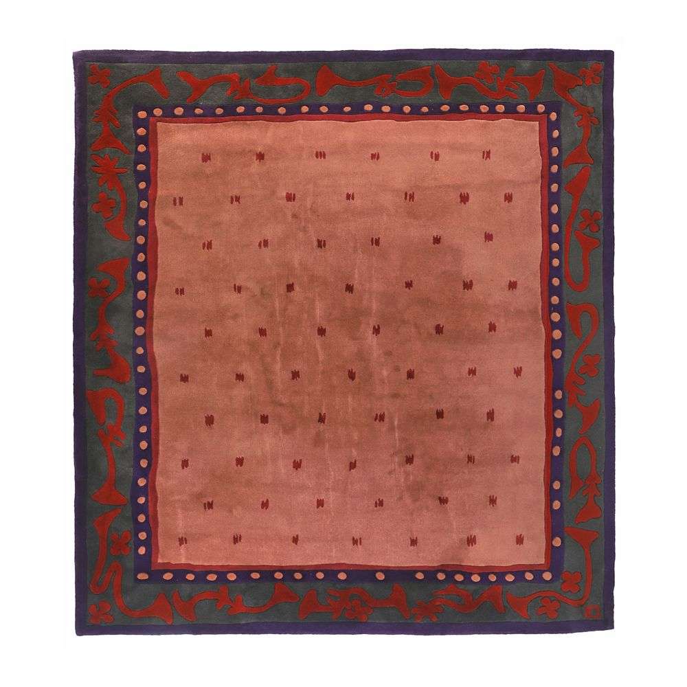 En tuft haute laine, à décor d'une frise de trompettes stylisées en bordure, teintes brique sur fond vert, liseré bleu nuit, centre animé de motifs abstraits brique sur fond beige, galon interne bleu orné de pois beiges.